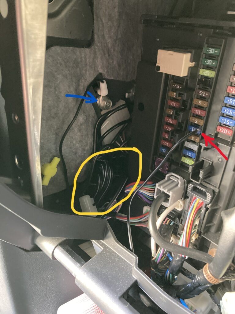 - 電源ケーブルをヒューズボックスからドラレコに通す