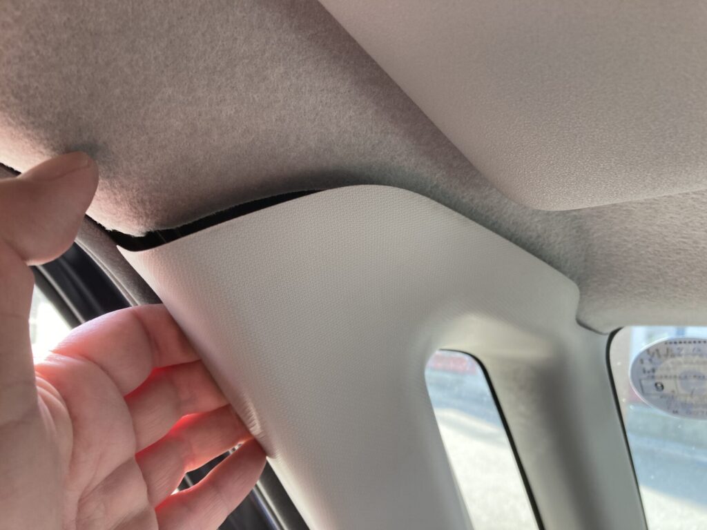ドアのゴムが邪魔なのでAピラー内張りのエッジが見える程度までずらし、Aピラー内張りの上側の横と上のエッジに指をかけ、慎重に力を加えて手前に剥がします。
