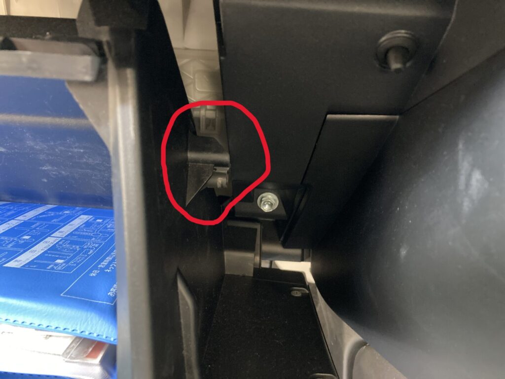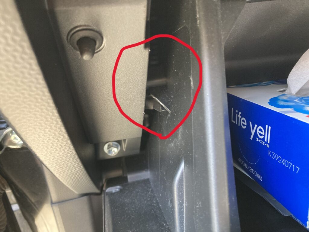 下の写真の赤丸部はグローブボックスの左側のストッパ。