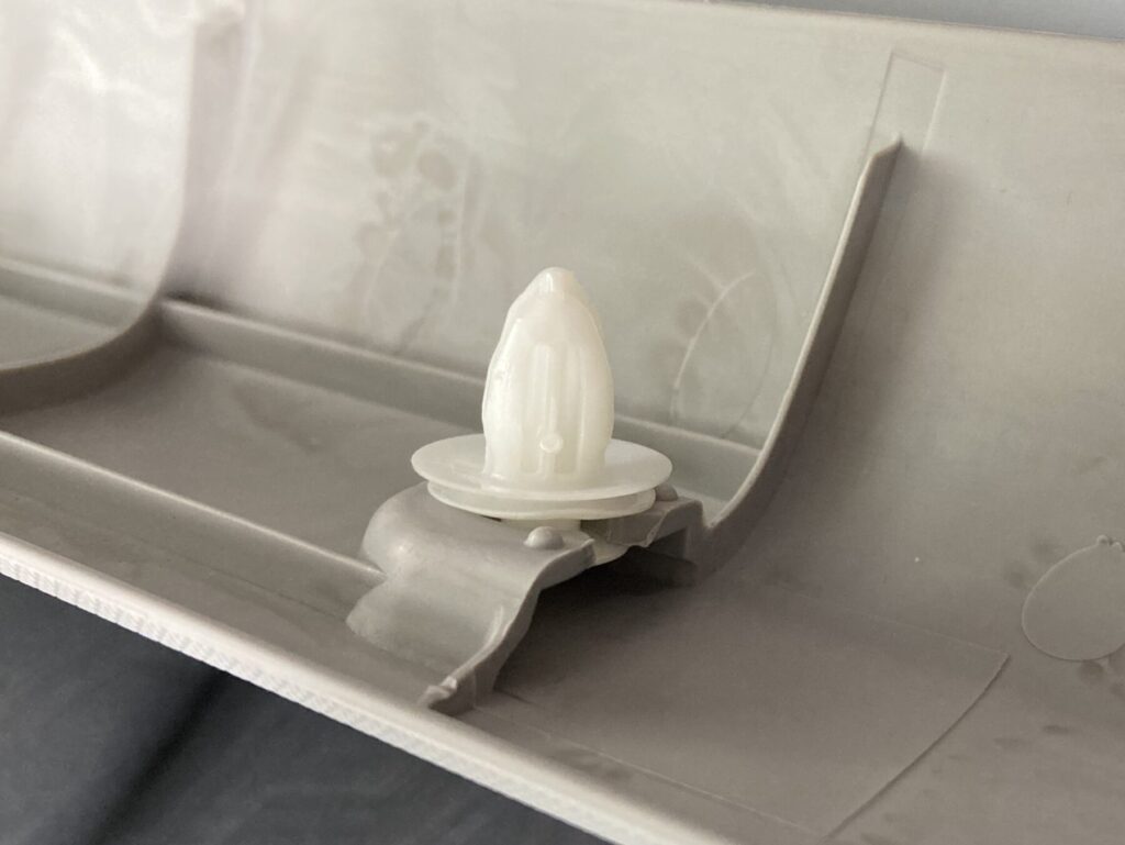 内張りは、車体フレームの穴にプラスチック製のクリップを差し込んで留めているだけなので、力ずくで引っ張れば外れます。