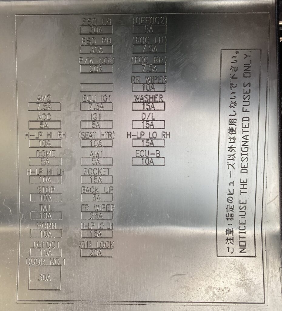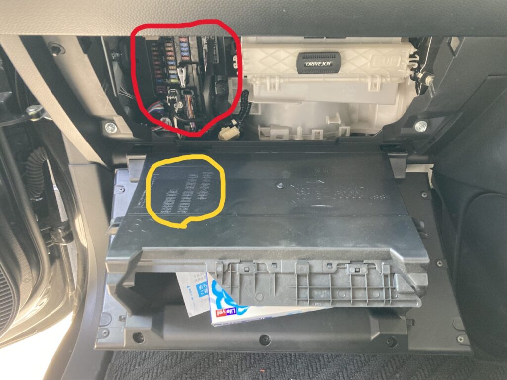 グローブボックスの裏の黄丸部に、ヒューズの配置図が記載されています。