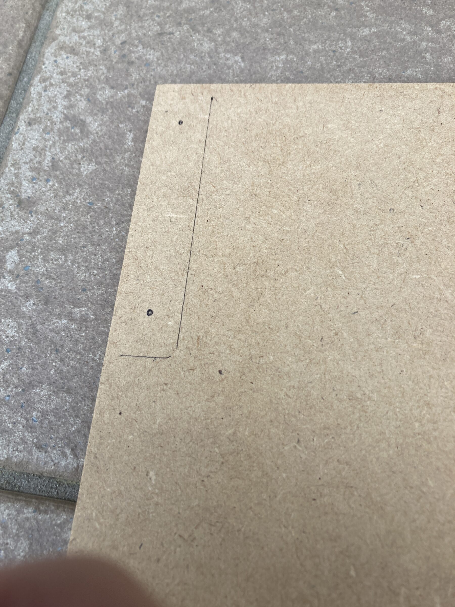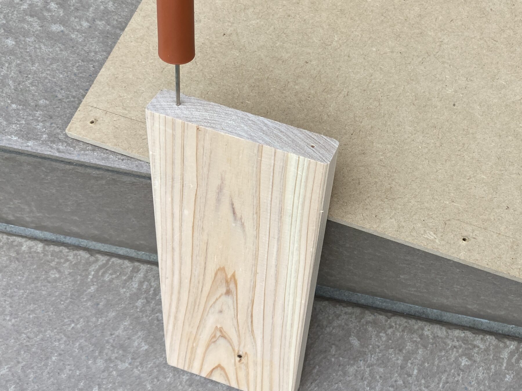 側板を天板にあわせ、キリを刺して側面の下穴位置を決める。