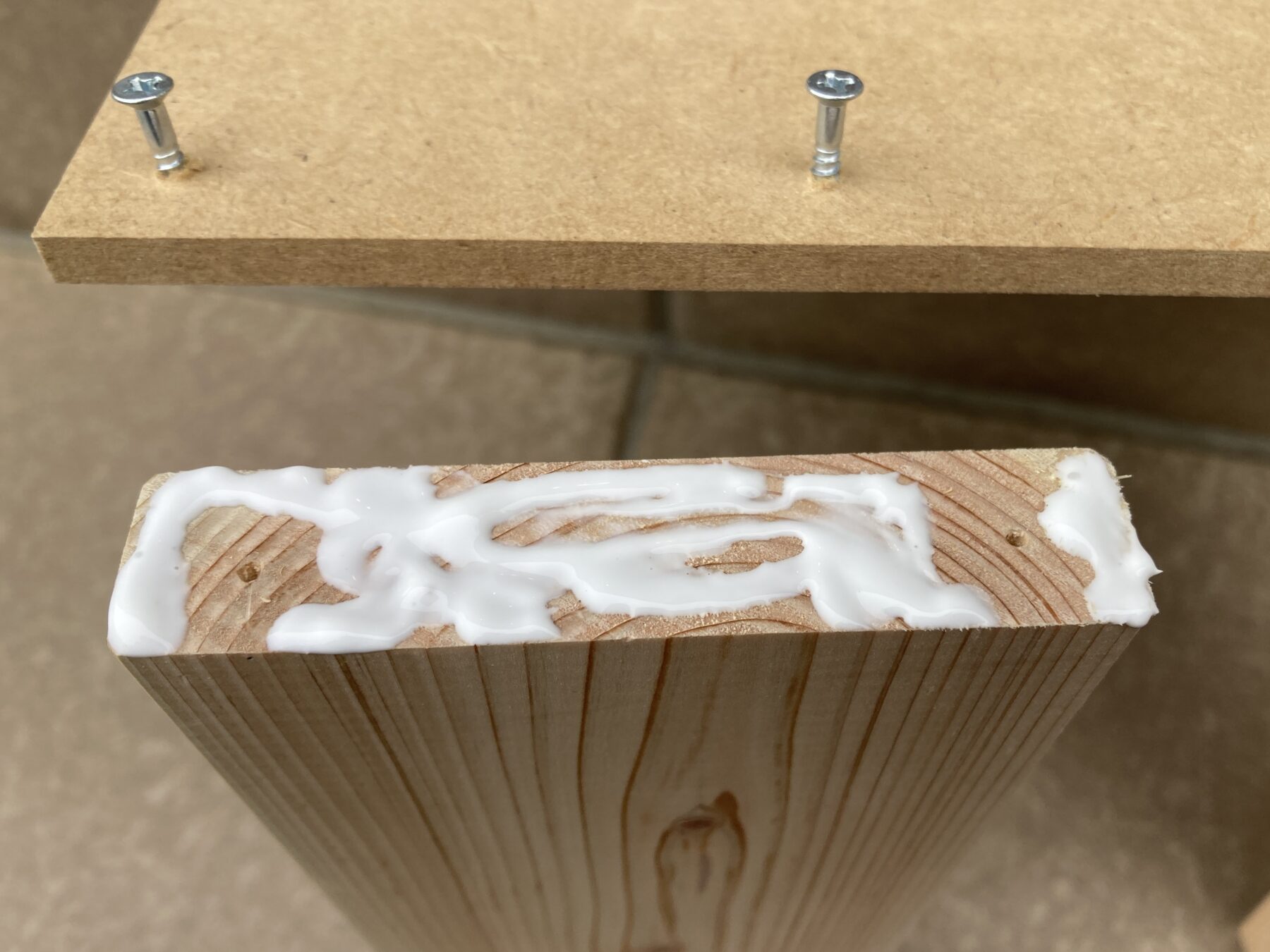 側面のネジ用下穴の位置が分かるように、下穴は避けてセメダインを塗布します。