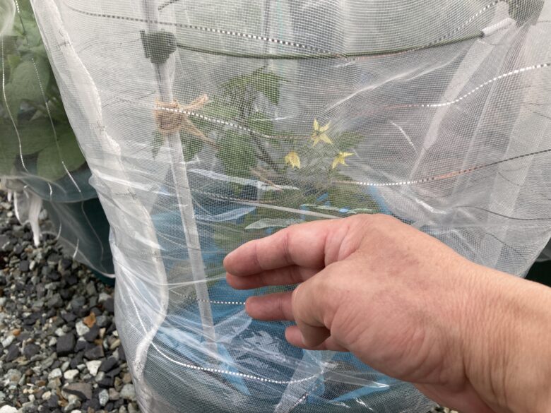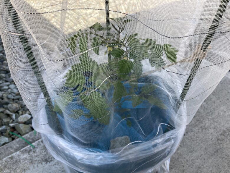 プランターの防虫ネットの上からビニール袋を被せるだけなので、温度が高く・風が弱い日はビニールを下げ、温度や湿度が上がりすぎるのを調整することも簡単です。