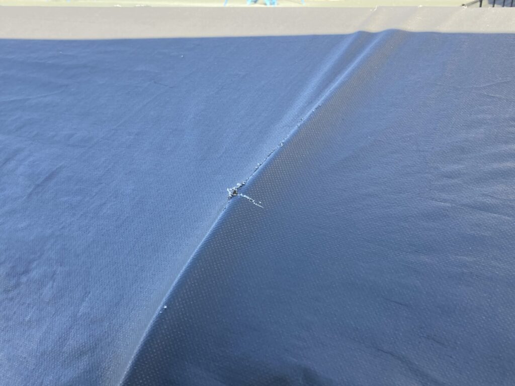 なので上部に積もる雪が多く加わる重さも大きい、加えて天幕材料の経年劣化もあり、天幕の頂上のフレームにあたる箇所にはひび割れや破れ等の劣化が見られました。