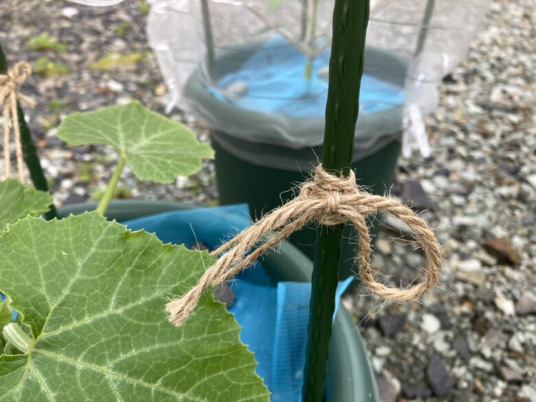 固定の仕方は色々ありますが、プランターの場合は3本支柱から麻紐を張り、茎を3方から支持する『ヒモ挟み込み誘引』がやり易いと思います。